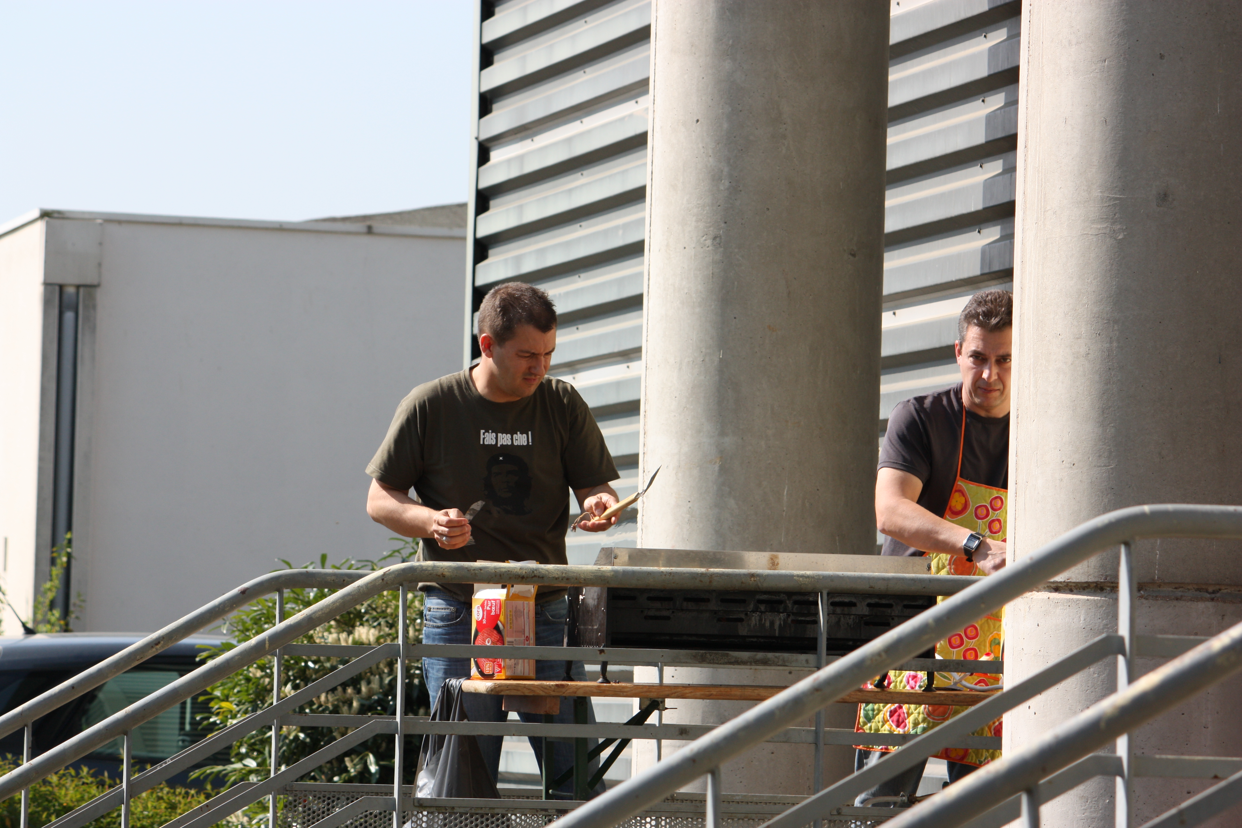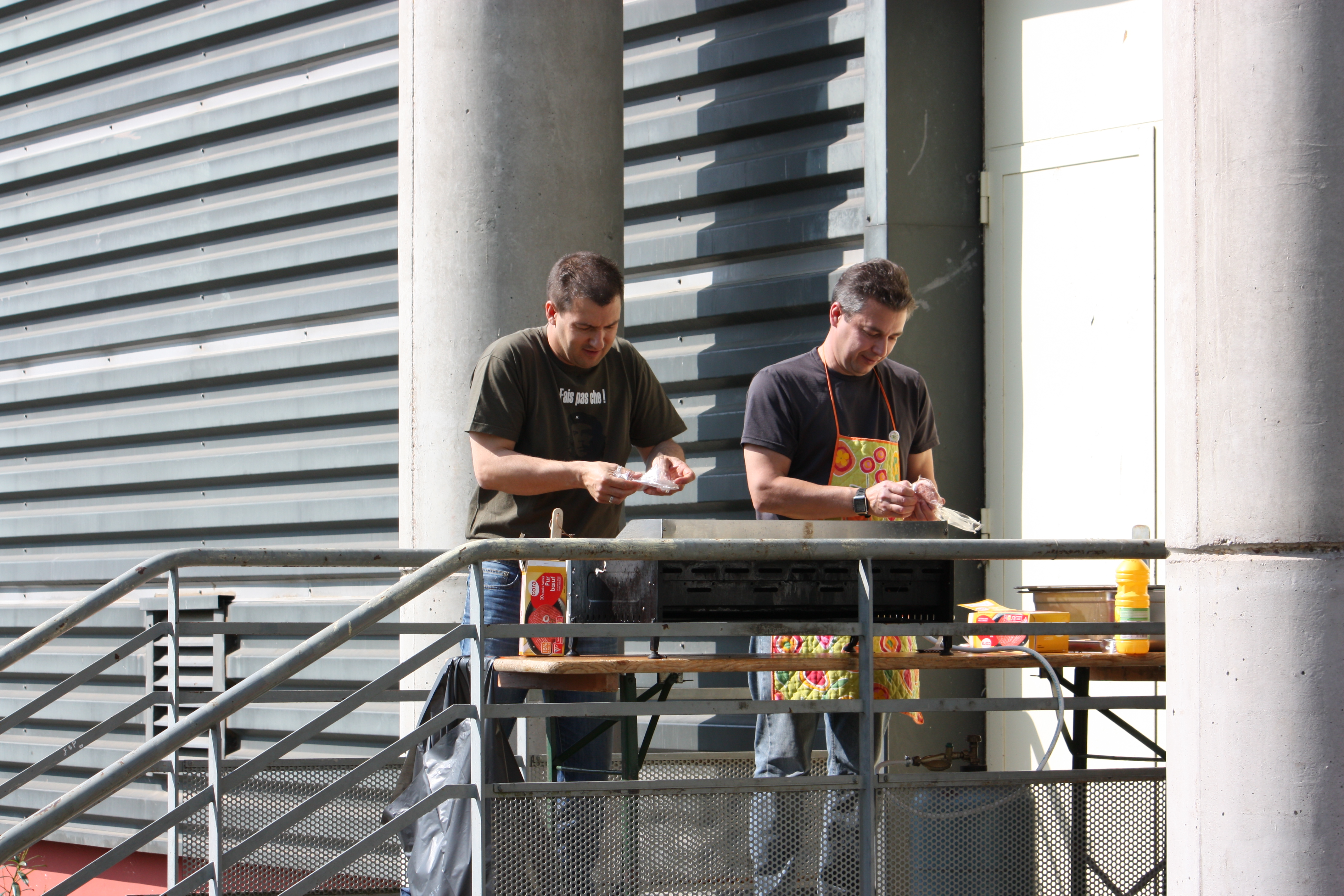 Il est 12h et tout le monde a faim. Coté cuisine ;-), les steaks sont en train de cuire et les assiettes contenant chips et crudités sont préparées pour tous les convives.